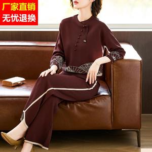 新中式妈妈秋装2025新款休闲 国风套装洋派中老年女装针织衫两件