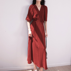 LYNEE 夏季千金风细闪丝灯笼袖披肩裹胸式连衣裙褶皱长裙