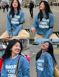 湖蓝色棉法语印花长袖套头衫卫衣