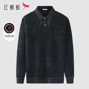 红蜻蜓男士假两件毛衣加绒加厚冬季新款休闲保暖爸爸装针织打底衫