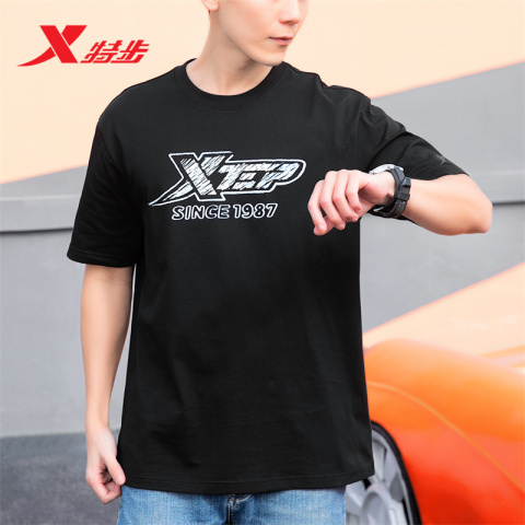 特步短袖t恤男夏季纯棉透气宽松黑色休闲上衣运动服男士半袖体恤