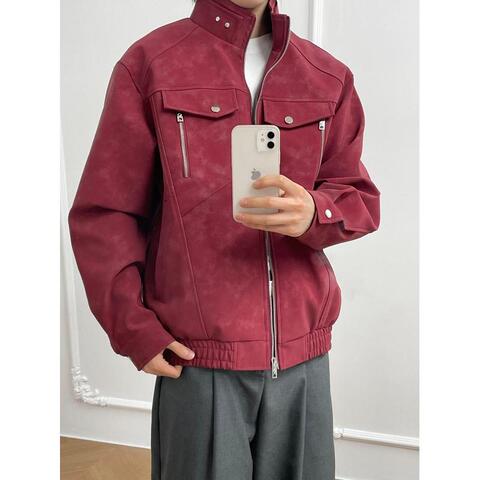 红色短款pu皮夹克男款秋季美式立领棒球服2025宽松纯色工装外套潮
