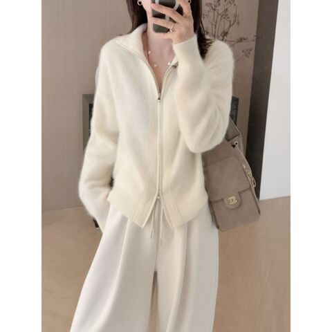 仓美美女装-双拉链毛感立领羊毛针织衫开衫
