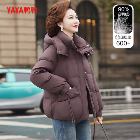 YAYA鸭鸭短款羽绒服女款中年妈妈鸭绒保暖冬装岁中老年人连帽外套