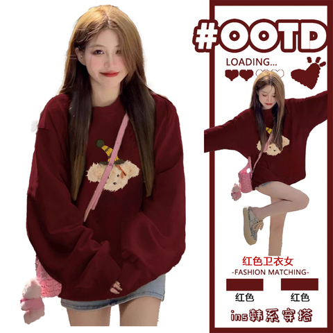 红色卫衣女春秋2025新款韩系加绒蛇年本命年开春穿搭宽松圆领上衣