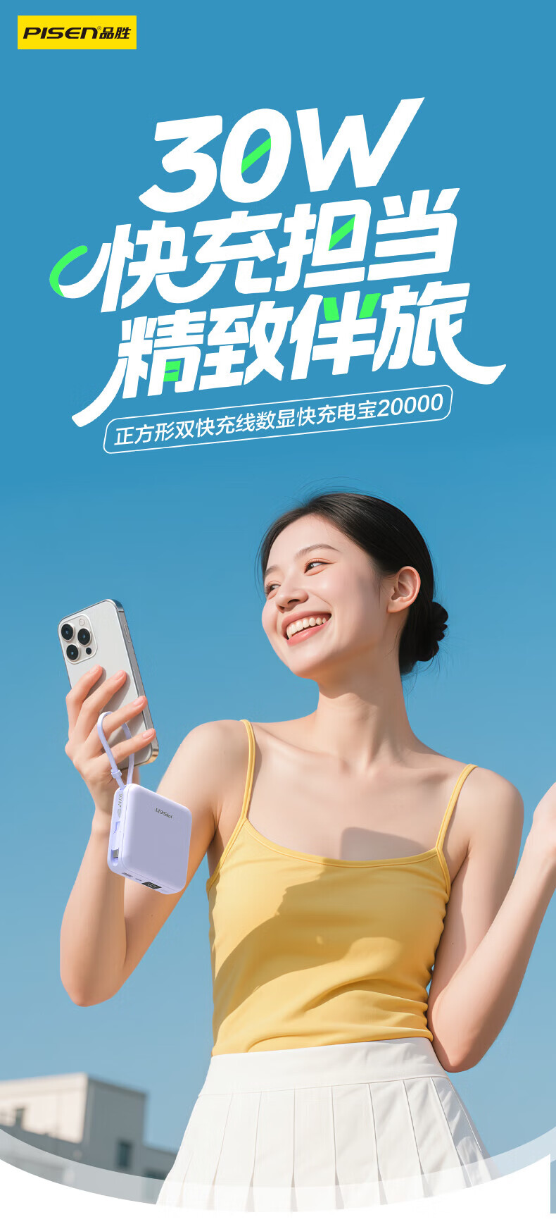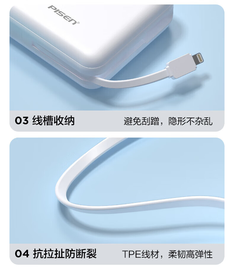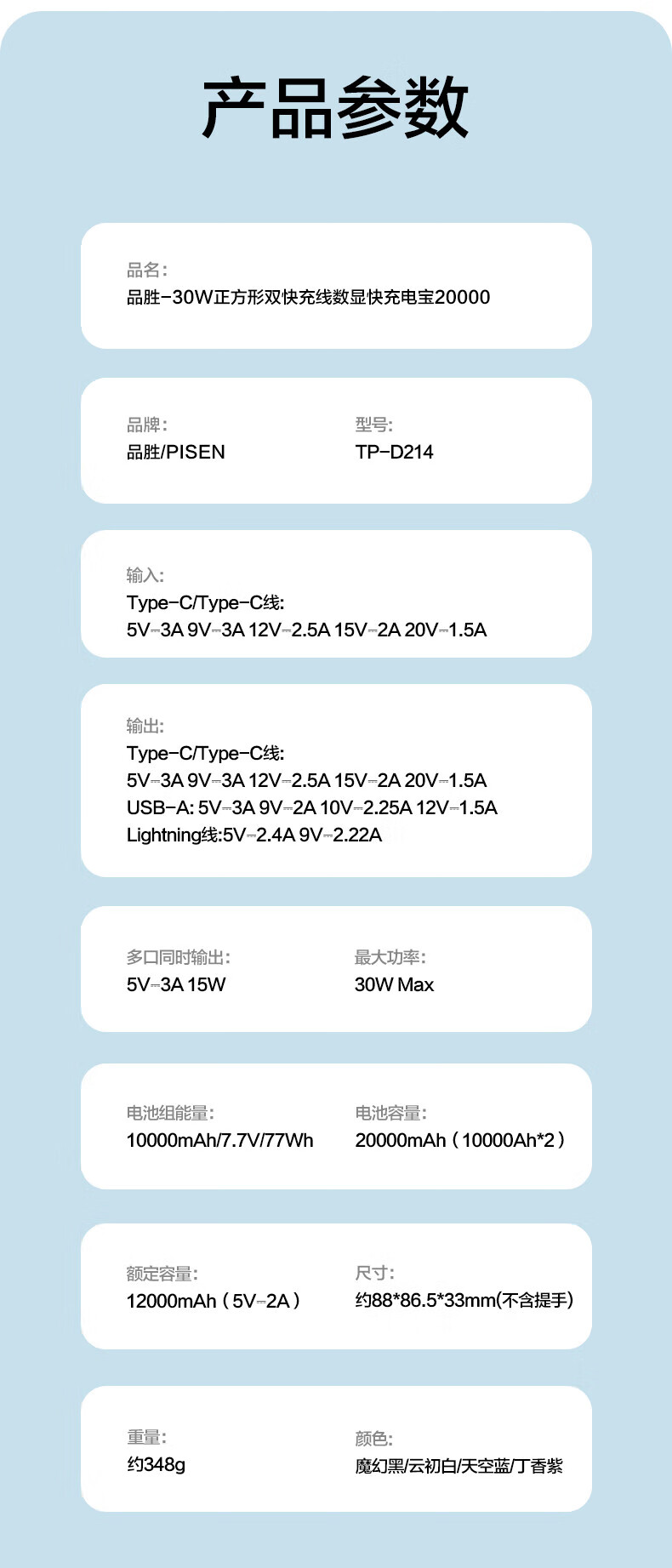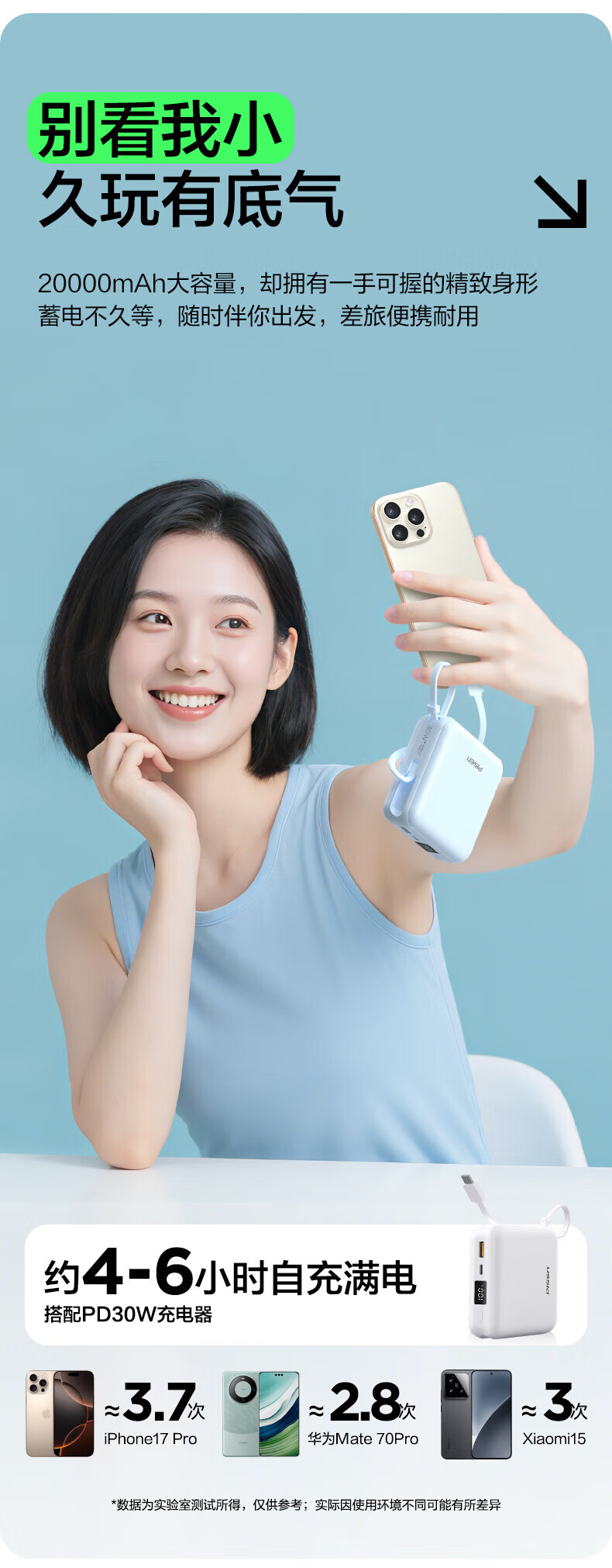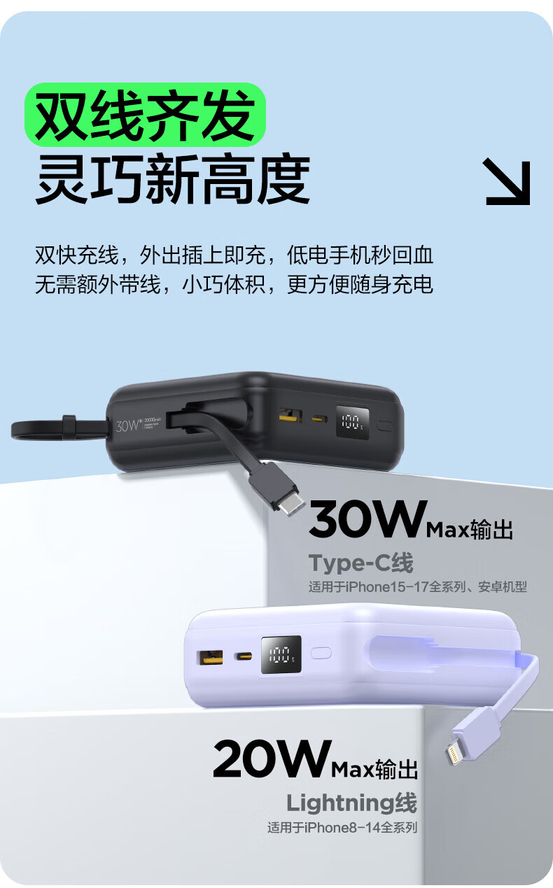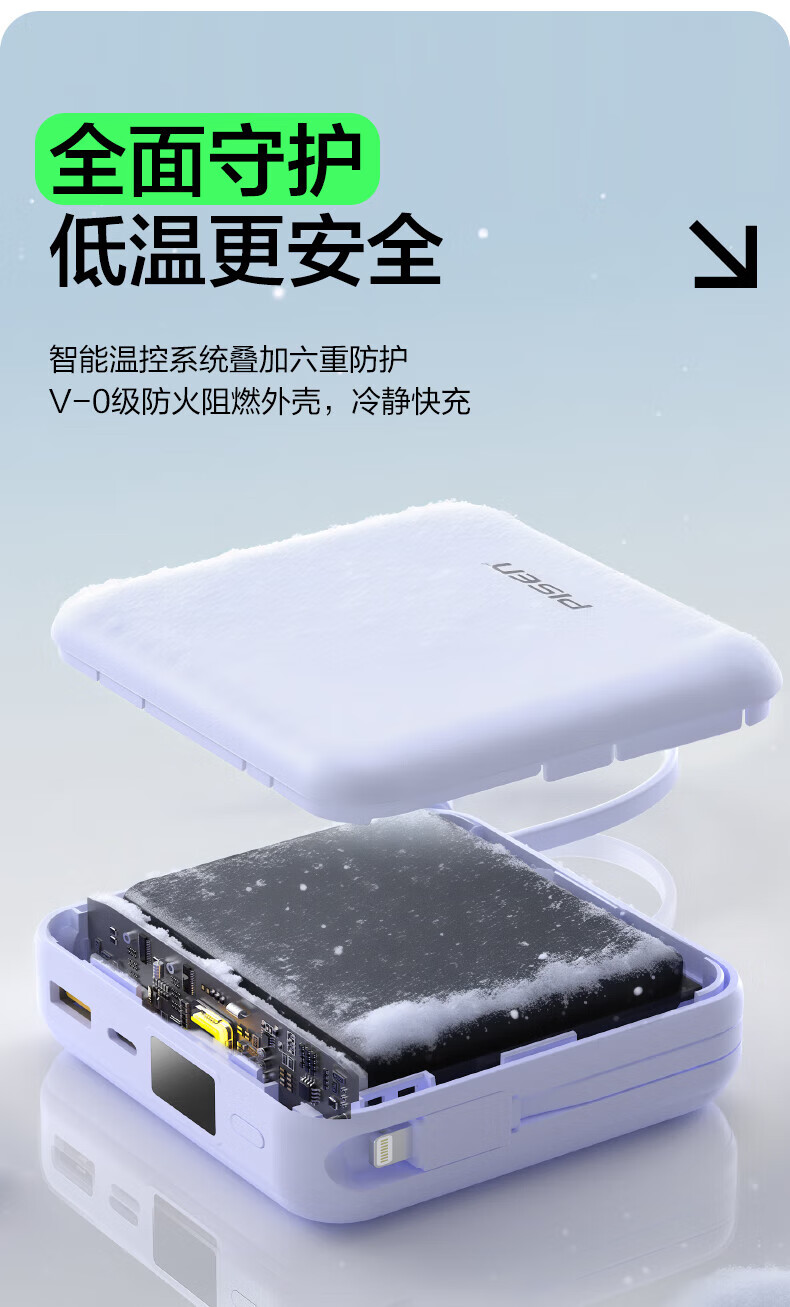 品胜(PISEN)【3C认证】充电宝自带双线20000毫安大容量可上飞机高铁22.5W快充移动电源适用苹果17小米华为 紫色【小巧双线|2万毫安】