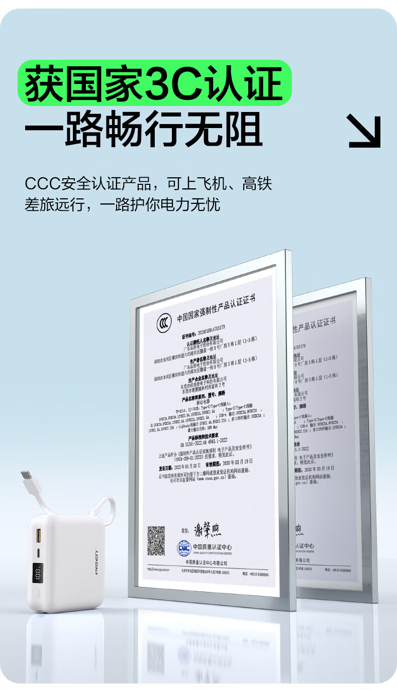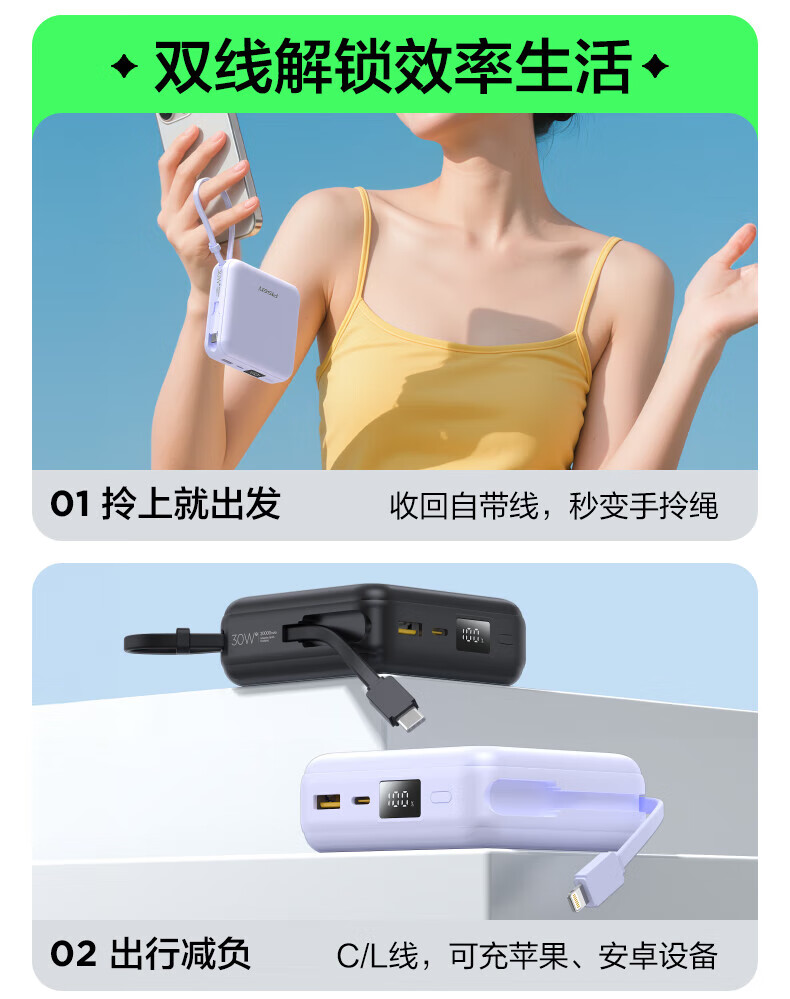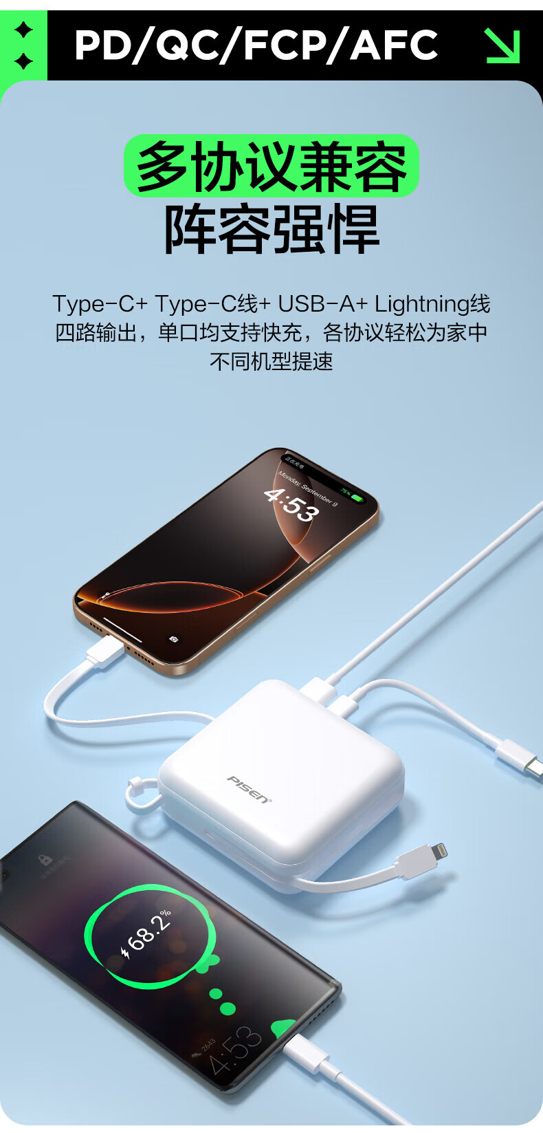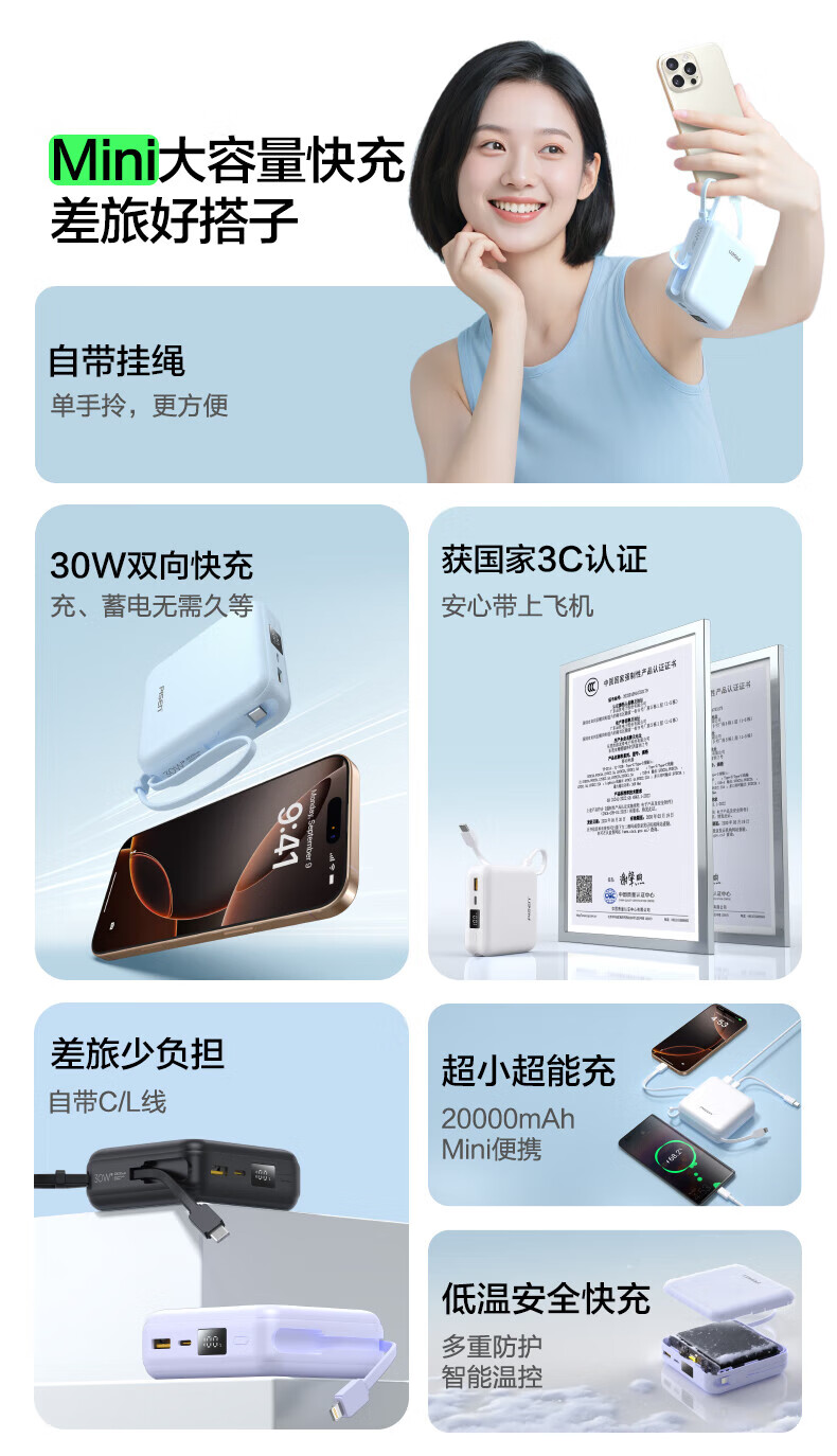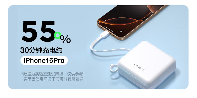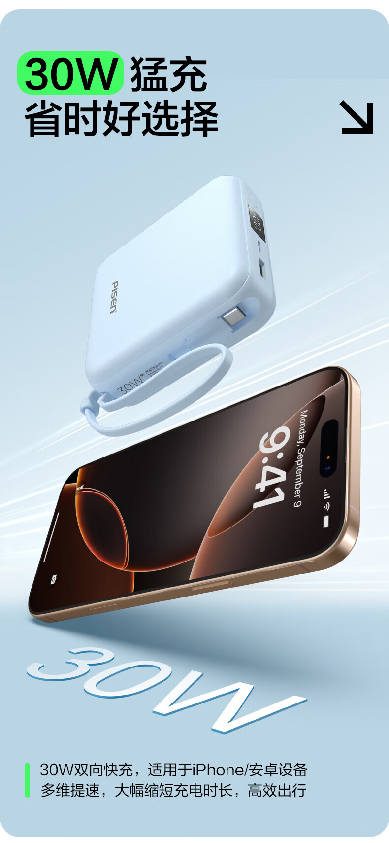 品胜(PISEN)【3C认证】充电宝自带双线20000毫安大容量可上飞机高铁22.5W快充移动电源适用苹果17小米华为 紫色【小巧双线|2万毫安】