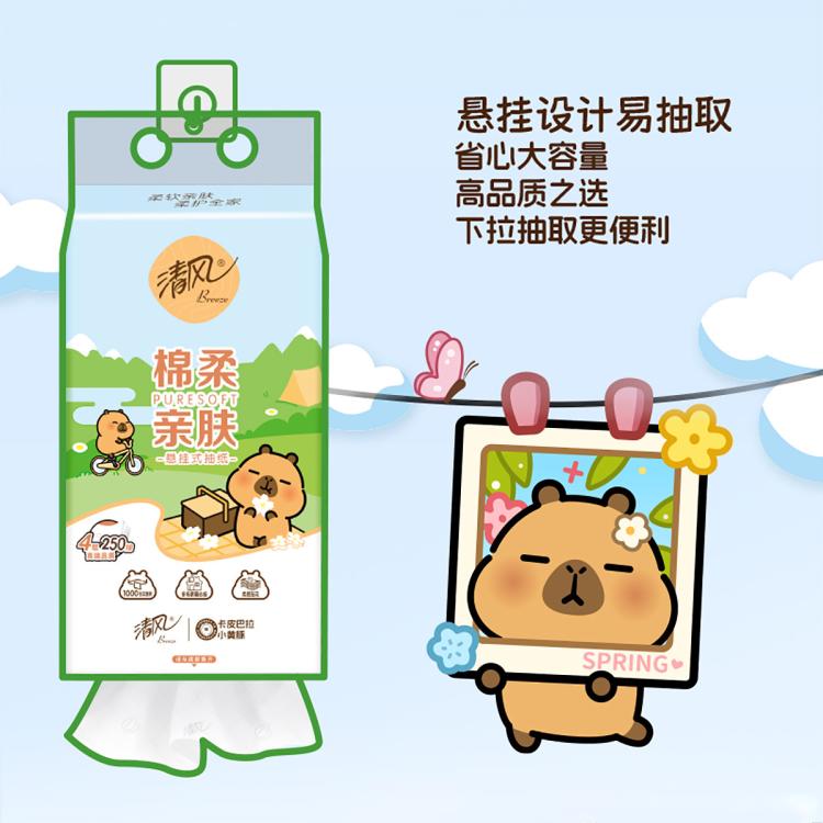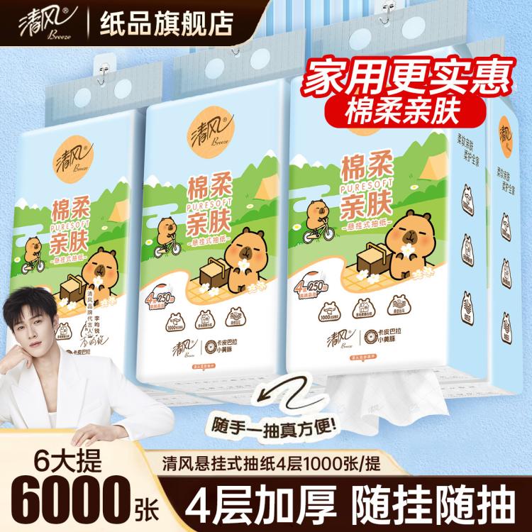 清风 【6大提1500抽】卡皮巴拉4层悬挂式便利挂抽家用加厚抽纸餐巾纸巾
